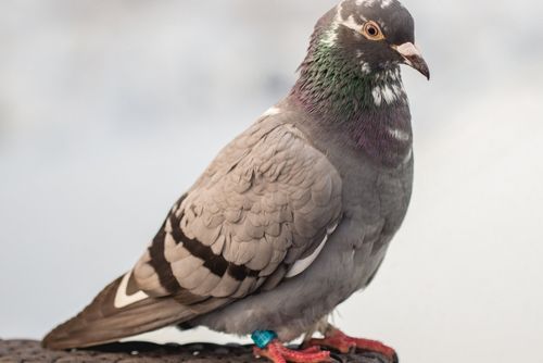 Coloured rings are used to signify if the bird is a show (fancy) pigeon or a racing pigeon. The rings are placed around one or both of its legs. Show pigeons have a ring number starting with 'NPA' and racing pigeons usually start with 'GB'. If you see a pigeon without a leg ring it's probably a wild pigeon.