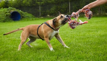 staffordshire bull terrier dog lying in RSPCA branded dog bed