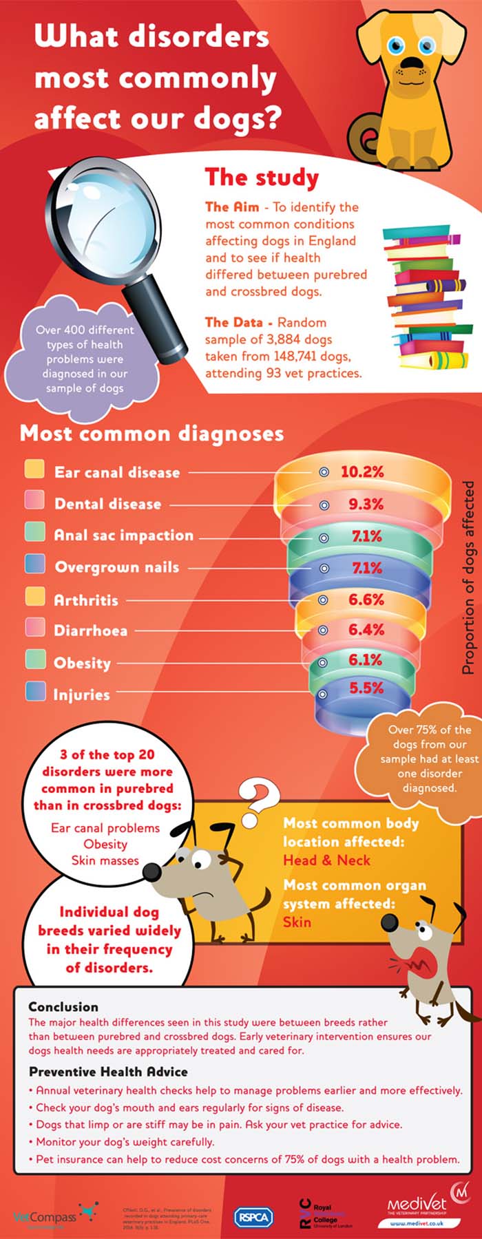That's why we've funded VetCompass PhD research to find out the disorders that most commonly affect our dogs. Find out what they are in our infographic! If you have any health concerns about your dog, please get in touch with your local vet.