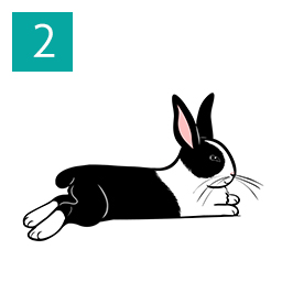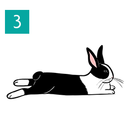 - This rabbit is lying down with a fully extended, relaxed body. Their back legs are stretched out behind the body and their front paws are pointing forward.